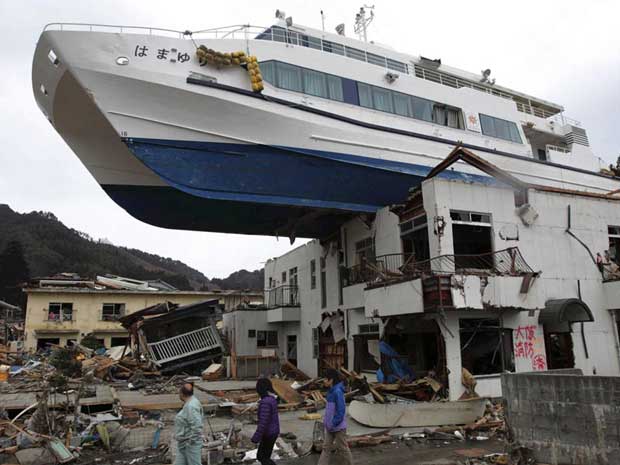 No Japão, onda de tsunami fez navio parar em cima de casa