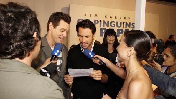 A pré-estréia do novo filme de Jim Carrey, Os Pingüins do Papai, realizada em um complexo de cinemas da Lagoa Rodrigo de Freitas, na zona sul do Rio de Janeiro, parece ter sido a oportunidade perfeita para o ator canadense encontrar-se mais uma vez com Rodrigo Santoro, parceiro no longa O Golpista do Ano, em 2009.