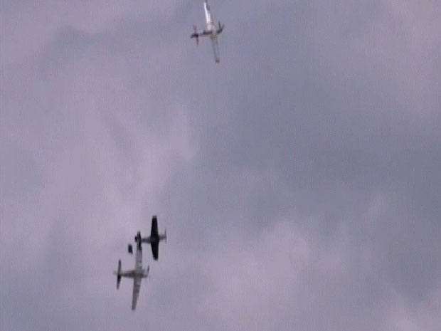 Uma das aeronaves, que seria um P-51 Mustang, caiu depois que as asas dos dois caças se tocaram, forçando o piloto a pular de paraquedas.