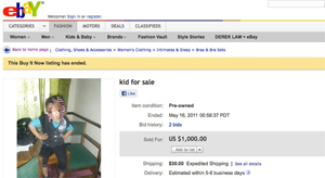 Em outro país, certamente, ela poderia ser enquadrada pela lei de tráfico de menores, por insinuar a venda de seus filhos em um site reconhecido internacionalmente por ser leilão de produtos e serviços.
