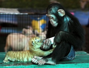 Chipanzé vira babá e da mamadeira a filhote de tigre na Tailândia