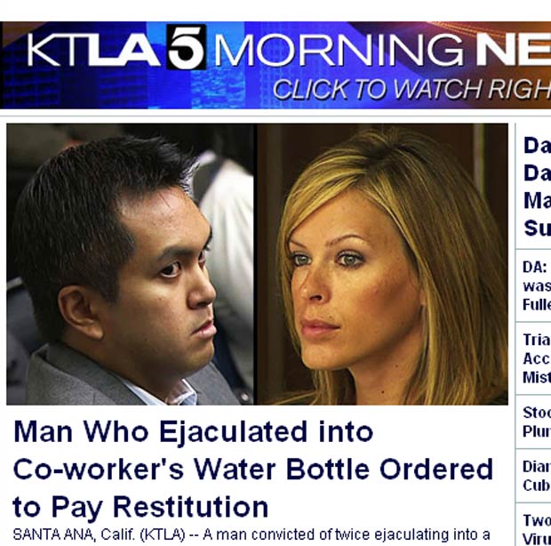 O americano que colocou seu próprio sêmen duas vezes na garrafa de água de uma colega de trabalho em Santa Ana, no estado da Califórnia (EUA), terá que pagar para a vítima US$ 27.410,80 (cerca de R$ 44,5 mil), segundo a emissora de “KTLA”.