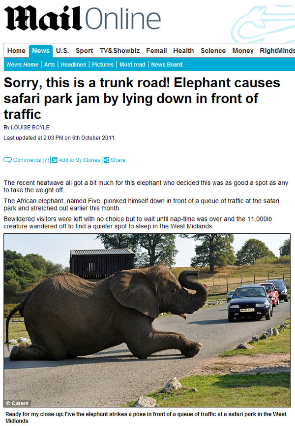 No meio da estrada tinha um elefante. Tinha um elefante no meio da estrada, e seu nome é Five. O simpático elefante africano quis aproveitar o belo dia para tirar uma soneca ao ar livre, o problema foi o lugar escolhido: bem no meio de uma via por onde carros circulam. A cena ocorreu dentro do Safari Park em West Midlands, na Inglaterra.