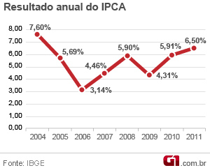 A inflação calculada pelo Índice de Preços ao Consumidor Amplo (IPCA) fechou 2011 em 6,50%, na maior taxa anual desde 2004, quando ficou em 7,60%, segundo dados divulgados nesta sexta-feira (6) pelo Instituto Brasileiro de Geografia e Estatística (IBGE). Em 2010, o indicador ficara em 5,91%.
