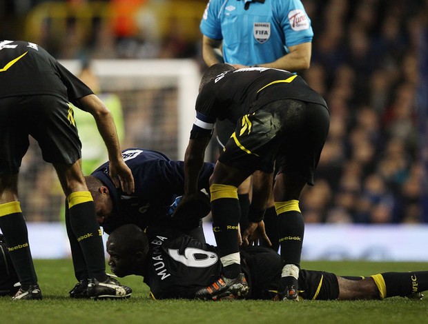O meia Fabrice Muamba, do Bolton, teve um mal súbito durante o jogo contra o Tottenham, neste sábado, pela Copa da Inglaterra, e foi levado ao hospital sem conseguir respirar, depois que os médicos tentaram reanimá-lo com desfibrilador ainda no gramado.