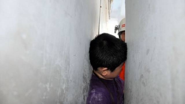 Depois de tentar espremer seu corpo por uma fresta de 10cm entre uma parede e uma coluna de cimento de sua escola, um aluno ficou preso pela cabeça no sudoeste da China.