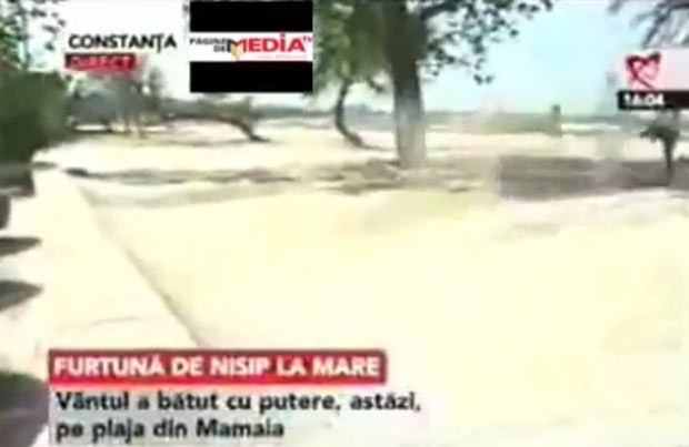 Um repórter do canal de notícias Realitatea virou motivo de chacota na Romênia depois que criou uma falsa tempestade de areia enquanto fazia uma reportagem sobre os ventos fortes na costa do país.