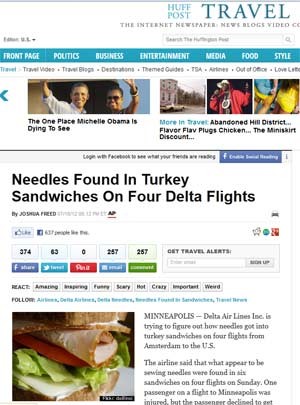 A companhia aérea Delta Airlines está tentando descobrir como agulhas foram parar dentro de sanduíches em quatro de seus voos de Amsterdã, na Holanda, para os Estados Unidos.