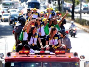 Em cima de dois carros do Corpo de Bombeiros, a comissão técnica e as jogadoras Fabi, Sheilla, Thaisa, Fernanda Garay, Natália, Fabiana, Adenizia, Fernandinha e Tandara ignoraram o cansaço da noite mal dormida e participaram de uma carreata pelas ruas de São Paulo.