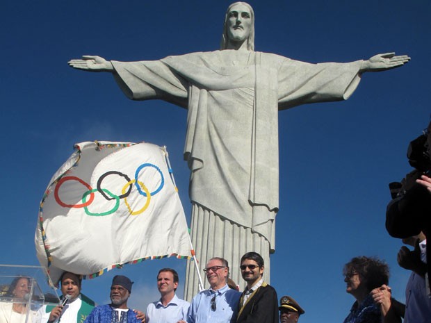 A bandeira símbolo dos Jogos Olímpicos, que serão sediados no Rio em 2016, foi levada na manhã deste domingo (19) ao Cristo Redentor, na Zona Sul do Rio de Janeiro, um dos mais importantes cartões-postais da cidade, eleito umas das novas sete maravilhas do mundo moderno.