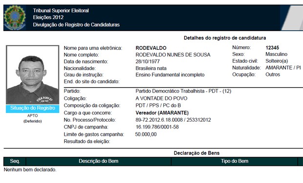 De acordo com dados do Tribunal Superior Eleitoral (TSE), Rodevaldo tinha 34 anos e participava de sua primeira eleição. Ele era filiado ao Partido Democrático Trabalhista (PDT).