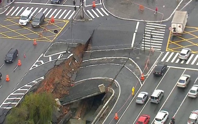 Chuva faz asfalto ceder e abre cratera em avenida na zona sul de São Paulo