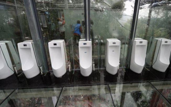 A obsessão recente da China por atrações envidraçadas acaba de chegar a outro patamar com a inauguração de banheiros públicos de vidro transparente. Os toaletes ficam perto do lago Shiyan, na província de Hunan, e foram construídos no topo das montanhas, na altura da copa das árvores. Além da vista privilegiada da floresta, os usuários também conseguem ver uns aos outros nas instalações.