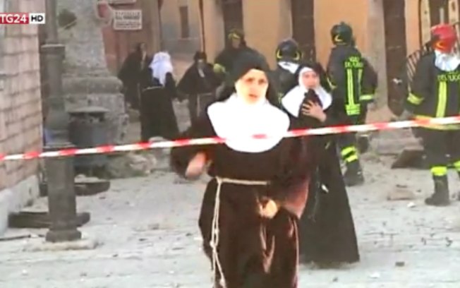 As freiras enclausuradas do convento de Santa Maria della Pace, que fica na cidade italiana de Norcia, tiveram de violar as regras centenárias e saíram às ruas durante os tremores do terremoto de 6,5 graus na escala Richter. As religiosas estavam em pânico e precisaram de ajuda de bombeiros neste domingo (30).