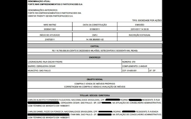 A Forte Mar Empreendimentos e Participações possui capital de R$ 116,7 milhões, informa a Jucesp. Ainda de acordo com o “Globo”, Filgueiras tinha participação de 10% no quadro societário da empresa.
