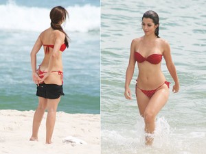 Após correr pelo calçadão e fazer alguns exercícios de alongamento, a moça decidiu se refrescar dando um mergulho no mar e desceu até a areia. Foi na hora de tirar o shortinho, a blusa e o tênis que estava usando, que ela fez a alegria do paparazzo e mostrou mais do que devia.