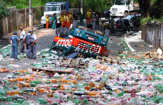 Caminhão carregado com bebidas tomba, deixa duas pessoas feridas e uma morta