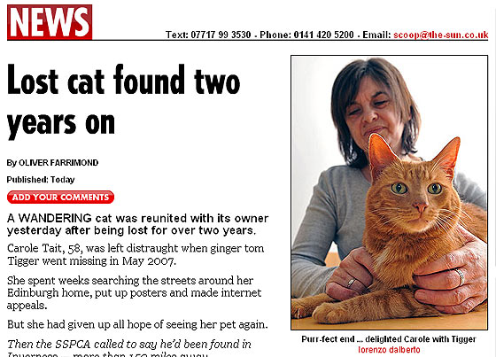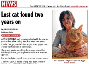 Carole Trait, de 58 anos, ficou desesperada quando Tigger, seu gato tigrado, desapareceu em maio de 2007.