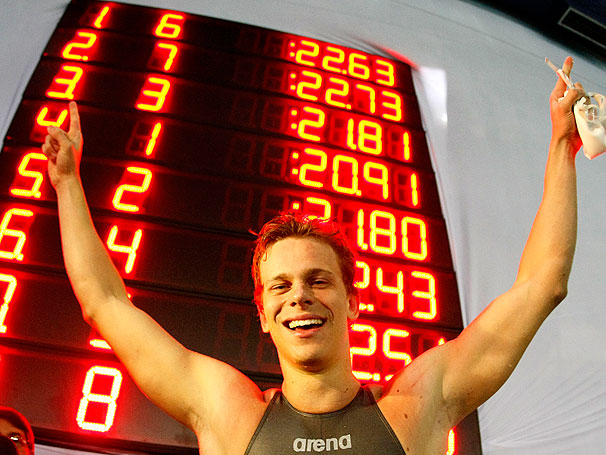 Foram dois dias batendo na trave. Na quarta-feira, na prova dos 100m, a diferença foi mínima. Na tarde de quinta, o brasileiro entrou tenso na piscina do Clube Pinheiros, após um atraso de 10 minutos na bateria anterior à sua. Mesmo assim, nadou abaixo do tempo que lhe valeu o título Mundial em Roma, neste ano, e ficou perto de quebrar o recorde do francês Frederick Bousquet (20s94). Nesta sexta, não teve jeito. Com 20s91, na raia 4, pelo torneio Open, ele deixou a tensão de lado e, enfim, superou a marca.