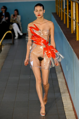 Afinal, foi usado um tapa-sexo com aplique de pelos ou a modelo realmente pisou na passarela mostrando a (pouca) depilação? O estilista Dudu Bertholini desfaz o mistério. “Usamos um tapa-sexo com aplique. Não existe stylist mais bonito do que o corpo da mulher, mas queríamos preservar a modelo”, explica ele. “A capa plástica funcionava como uma radiografia da modelo, então era natural que ela entrasse nua”, acrescenta.