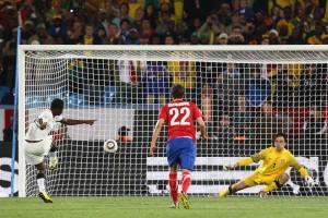 Sérvia e Gana caminhavam para mais uma empate na Copa do Mundo de 2010. Até que, aos 39 minutos, Asamoah Gyan tirou o zero do placar convertendo o primeiro pênalti dado neste Mundial. Este também foi o primeiro triunfo de uma seleção africana no seu próprio continente.