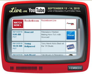 O site YouTube lançou nesta segunda-feira (13) um teste limitado de vídeos ao vivo com plataforma streaming, que permite assistir aos vídeos on-line, sem precisar armazenar dados. O piloto de dois dias, que termina nesta terça-feira (14), será realizado com outros quatro parceiros (Howcast, Rocketboom, Next New Networks e Young Hollywood).