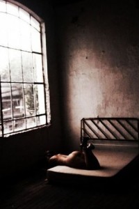 Em uma das imagens, a moça aparece deitada de costas em uma cama, como se procurasse algo no chão.