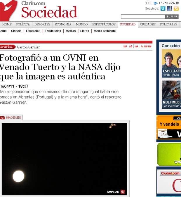 A Nasa (agência especial dos EUA) confirmou a autenticidade de uma imagem que mostra um suposto óvni nos céus de Venado Tuerto, na Argentina.