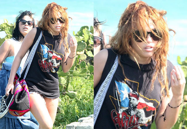 Na saída da praia, ela foi fotografada carregando uma bolsa, usando regata e short jeans. Ela tomou sol cercada por quatro seguranças. Na ocasião, Miley estava acompanhada por sua mãe.