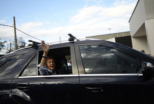 O músico Paul McCartney acena para os fãs ao chegar ao Engenhão para passagem de som antes do show deste domingo (22).