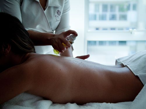 Depois, aplica-se água termal para abertura dos poros e hidratação superficial. Em seguida, a esteticista começa a aplicar o óleo corporal de Azeite Extravirgem fazendo uma massagem por todo o corpo com movimentos suaves e revigorantes.