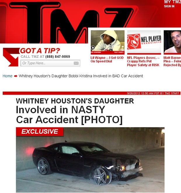 Segundo o site “TMZ”, Bobbi Kristina, filha da cantora Whitney Houston, se envolveu em um acidente de carro na noite deste domingo, 23.