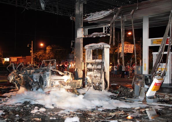 Posto de gasolina pega fogo após motorista ter batido o carro em uma bomba de abastecimento
