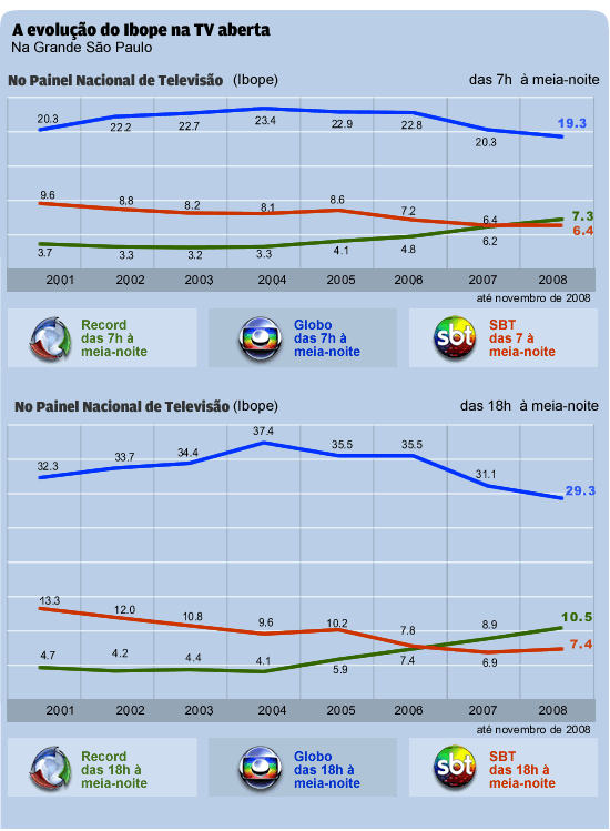 Na Grande SP, a queda da emissora também é significativa: em 98 a média de ibope do SBT era de 12 pontos no horário nobre, mas dez anos depois ela já está em 7,5 pontos (queda de 37,5%).