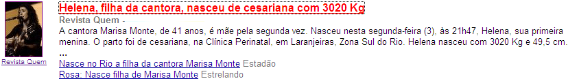 Pois é, hoje quando vou olhar o google, me deparo com esta notícia onde relata que Marisa Monte teve sua filha Helena de cesariana, o detalhe da notícia é que a menina teria nascido com 3020Kg.