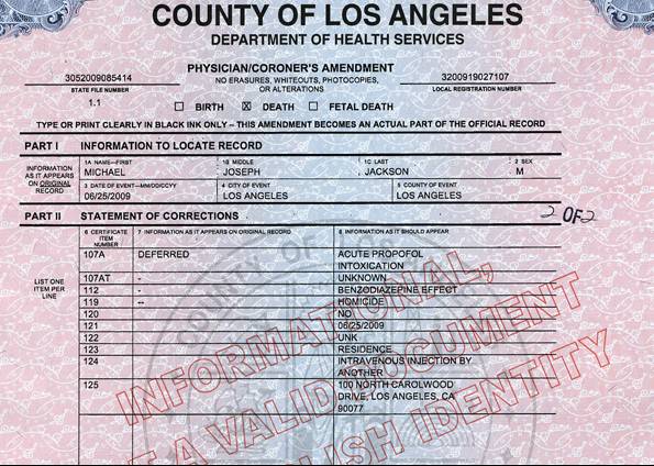 A certidão de óbito de Michael Jackson recebeu uma emenda para incluir as circunstâncias de sua morte, declarada como homicídio e especificada como “injeção intravenosa por um outro”